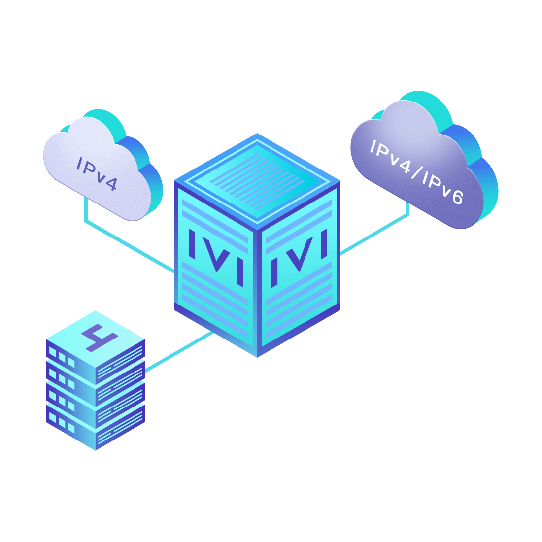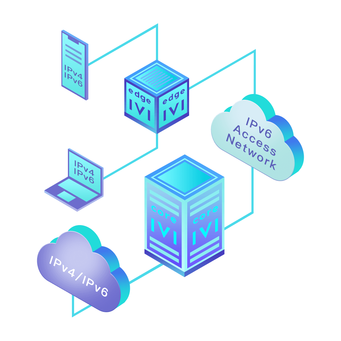 對正在進(jìn)行IPv6整體升級規(guī)劃的運(yùn)營商,應(yīng)用IPv6升級方案2.5,通過IVI無狀態(tài)翻譯技術(shù)和純IPv6接入網(wǎng)絡(luò),為雙??蛻舳撕碗p棧服務(wù)器提供連通服務(wù)。